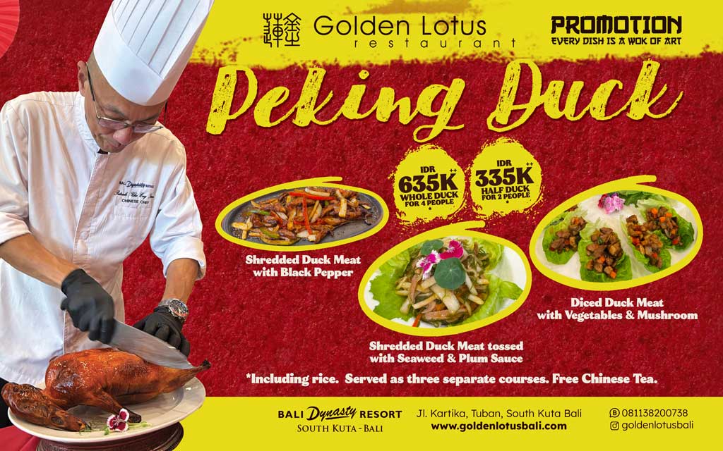 The Golden Lotus Restaurant invites you to savor their delightful “All You Can Eat Dimsum” offer. For just IDR 210.00 ++ per adult, indulge in an array of delectable dim sum dishes, elegantly served in traditional bamboo steamers.
